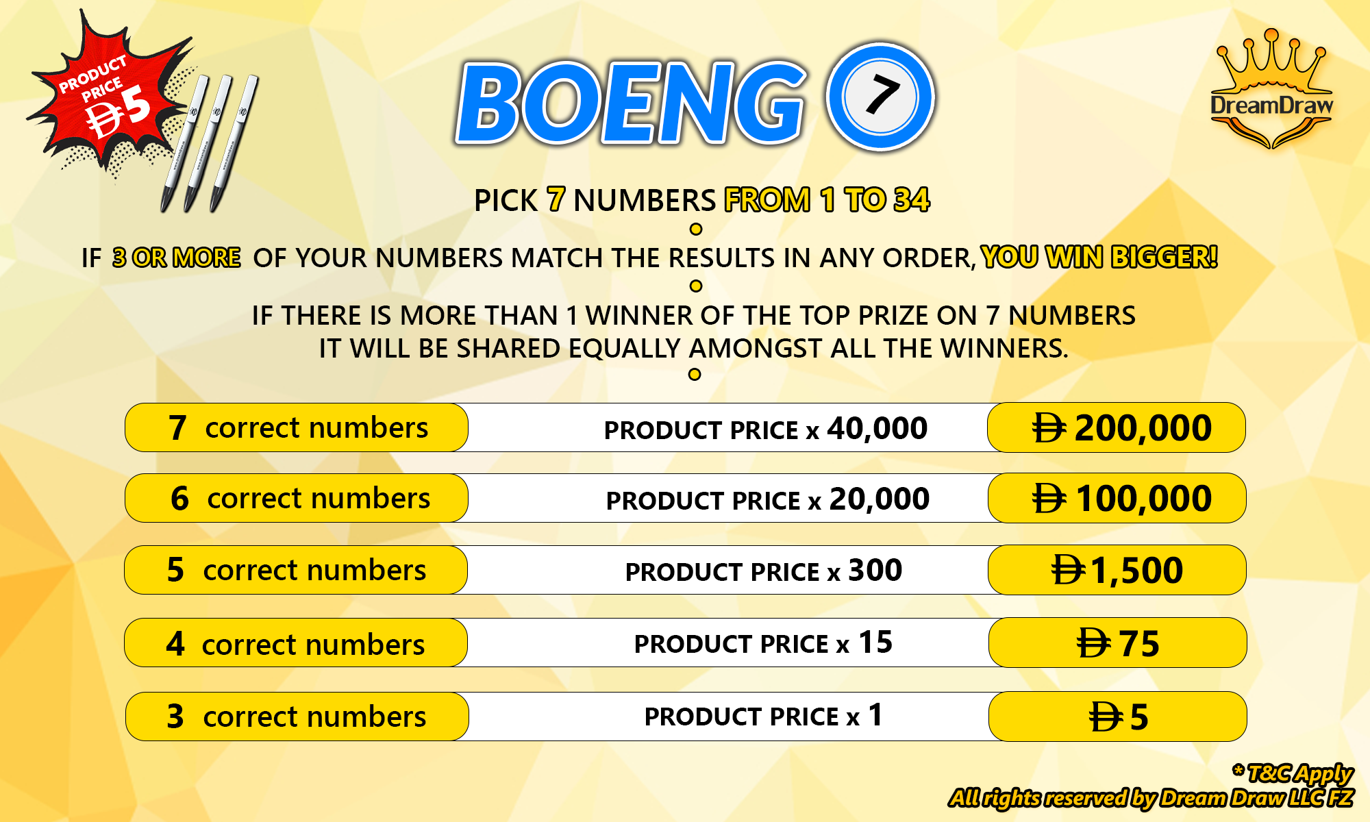 • Prize: 5 AED X 4 times your Product Prize for 1 correct number (e.g., X-X-7).